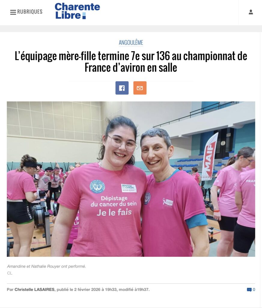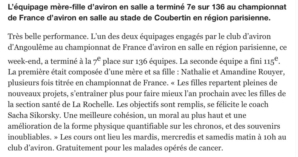 Angoulême, Mère et Fille 7ème au championnat de France d’aviron en salle.