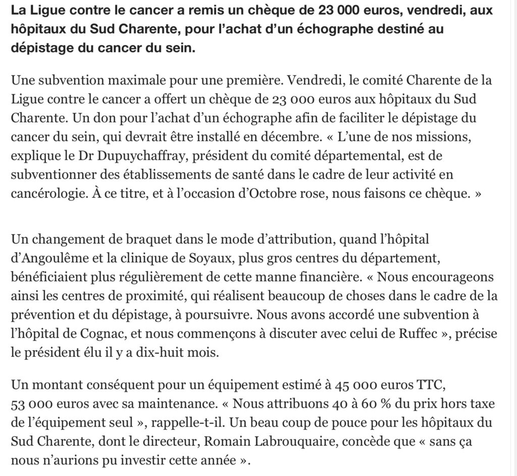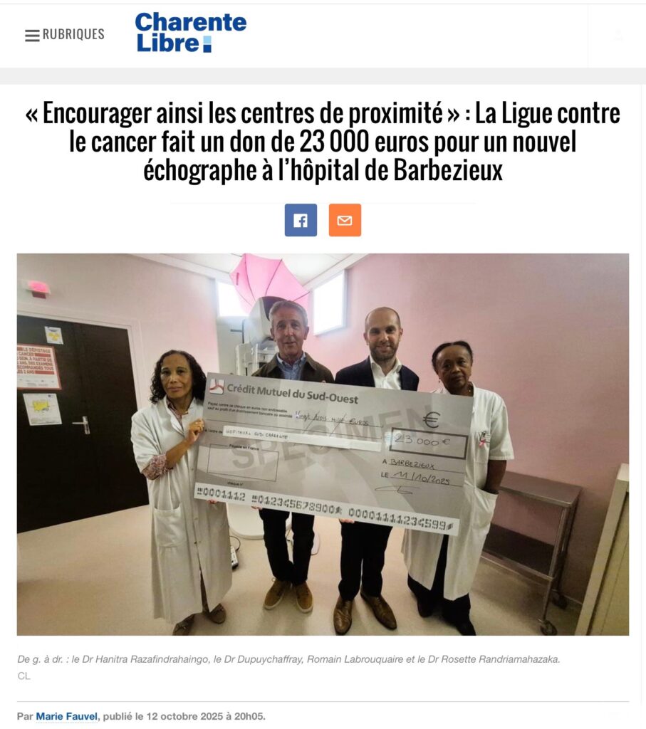 La Ligue contre le Cancer de Charente fait un don à l’hôpital de BARBEZIEUX pour un nouvel échographie par cd16 · 14 octobre 2025